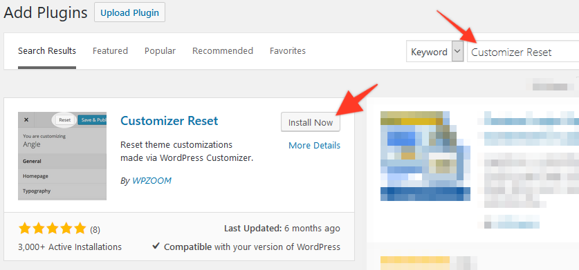 2. Search for “Customizer Reset” in the search bar on the right-hand side. Then click “Install” as shown below. Wait for installation to complete, then click “Activate”.